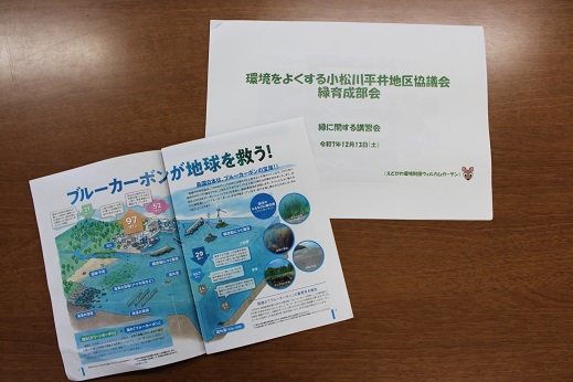 はじめに、えどがわ環境財団スタッフによる環境レクチャーが行われて、国土交通省港湾局の「海の森 ブルーカーボン CO₂の新たな吸収源」の資料をもとに、海の植物の生態系の話や気候変動対策の取組を紹介しました。またグリーンカーボンである花やみどりを植えて育てることは地球温暖化を遅らせる活動でもあることなどを学習しました。