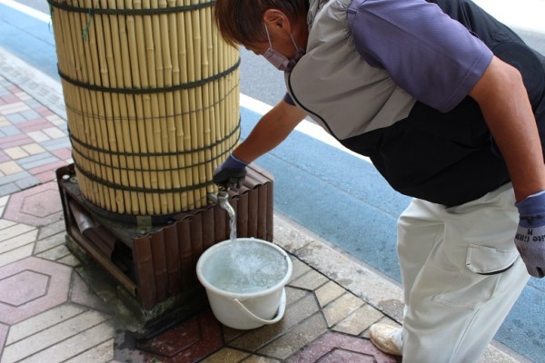 フラワーロードには、何か所か雨水を貯めたタンクが設置されています。そのタンクから花壇へ水やりをしています。