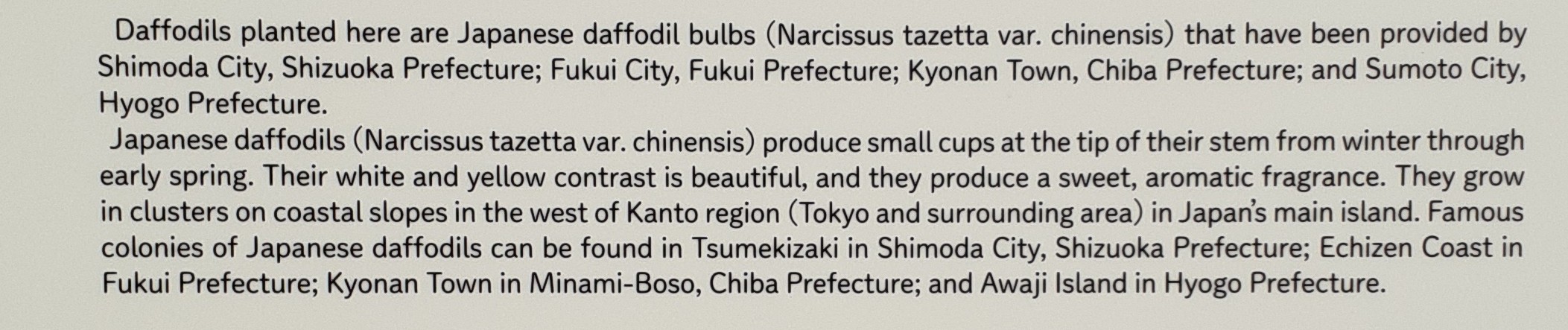 こちらの畑には5万7千球の二ホンズイセン(日本水仙)が植えられてます!爪木岬に咲く300万本の水仙が見どころの静岡県の下田市、日本海の雄大な越前海岸に水仙の群生地が広がる福井県福井市、江戸時代から水仙の出荷が盛んだった千葉県の鋸南町(きょなんまち)、兵庫県の洲本市から提供されたものです。
