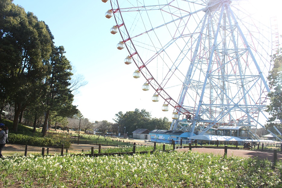 スイセン畑は花とダイヤの大観覧車の下にあります。そんな寒さの中でもきれいに咲くスイセンを撮影しようとカメラを持った方の姿が多く見られました。