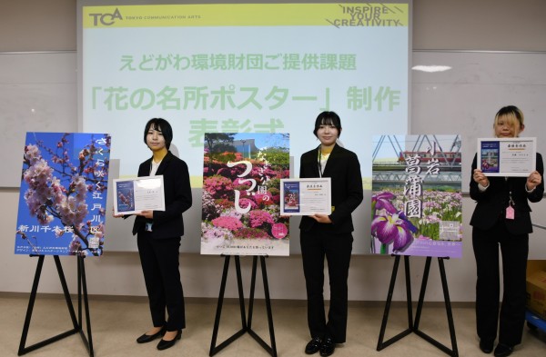 TCAの学生が個性あふれる作品を制作し区の選考を経て1年生の天野 優さん、村山 翔萌(かほ)さん、佐藤 はるなさんの作品が最優秀賞に選ばれ、花の名所をPRするポスターとなりました。