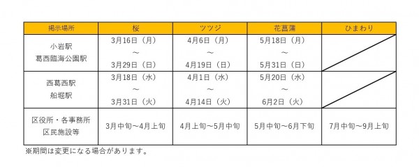 これらの魅力的な作品は江戸川区内の各駅や区民施設に以下の予定で掲示されます。是非、ご覧ください!