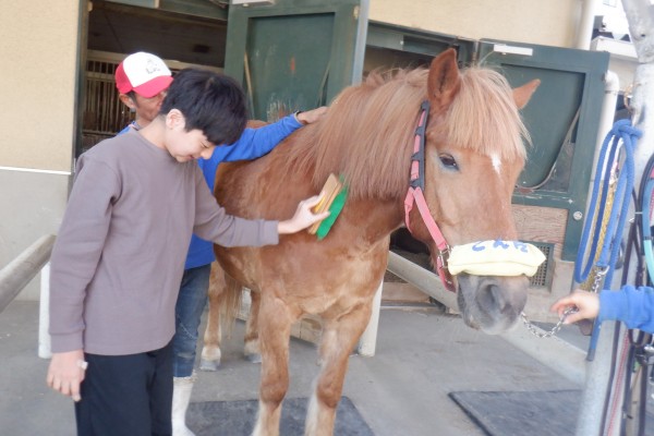 子ども達は乗馬をしながら輪投げをしたり、馬の体に付いたおがくずを丁寧に取り除いたり一生懸命頑張る様子が見られました。