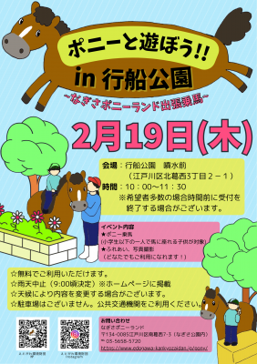 2月19日(木)に行船公園へなぎさポニーランドのポニーが出張いたします!!