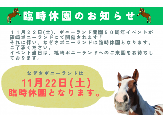 11月22日(土)なぎさポニーランドは臨時休園となります。