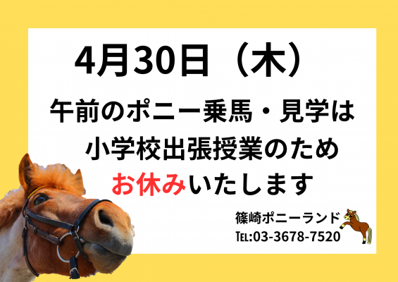 - 【篠崎】4月30日午前のポニー乗馬お休みのお知らせ