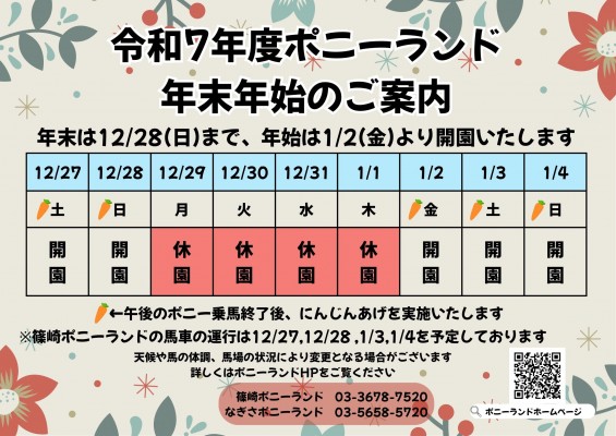 令和7年度ポニーランド年末年始の開園日をお知らせいたします。