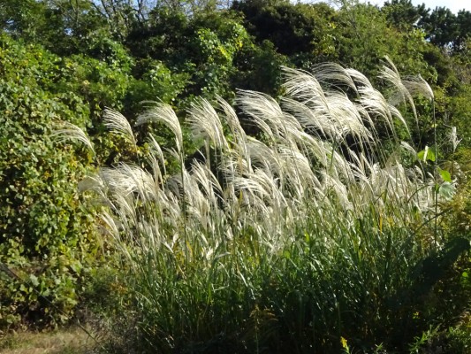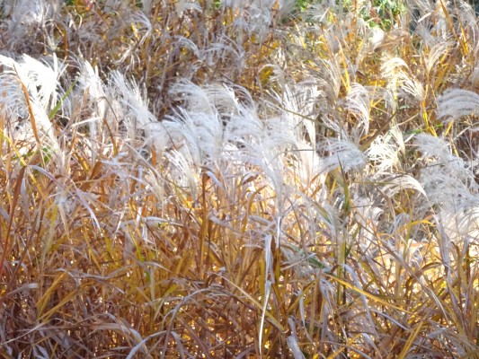 鳥類園ウォッチングセンターの南側にオギがあり、穂が日を浴びて銀色にキラキラ輝いていました。