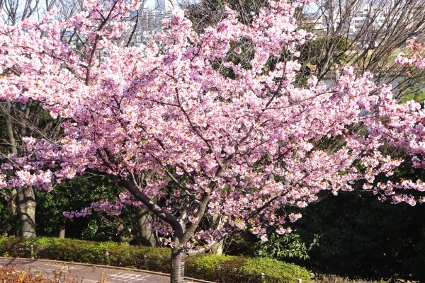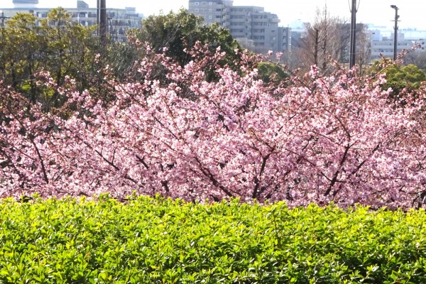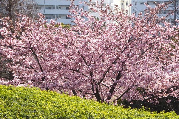 更に場所を変えると植込みがあり、その緑の植込みの上に河津桜が咲いており、また全く違った景色になっていました。
