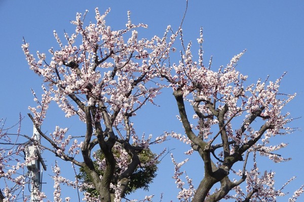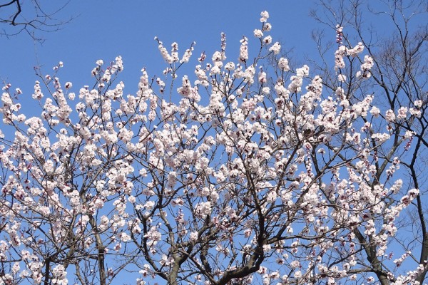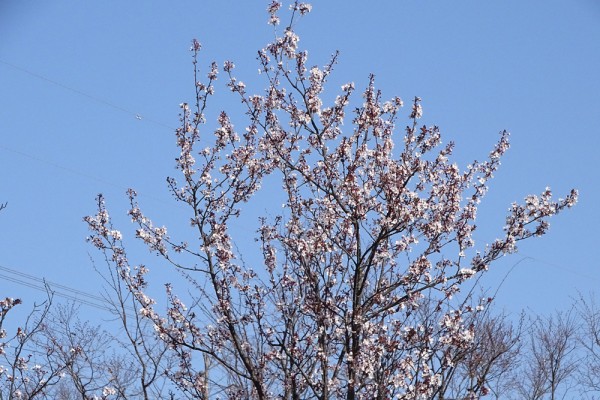 清新町二丁目の児童遊園広場のアンズが満開でした。この樹は花付き