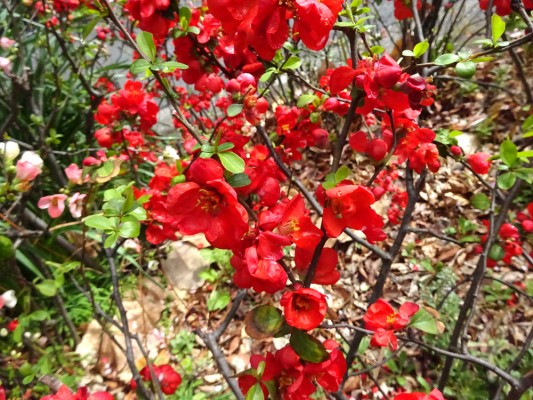 には、ところどころにボケが植えられており、ピンクの花も咲いています。