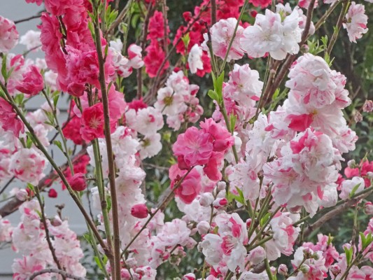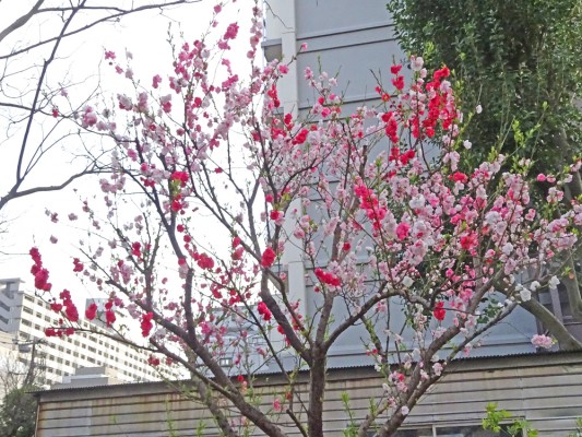 3月30日に西葛西の集合住宅の敷地のゲンペイモモ(源平桃)が咲き始めて