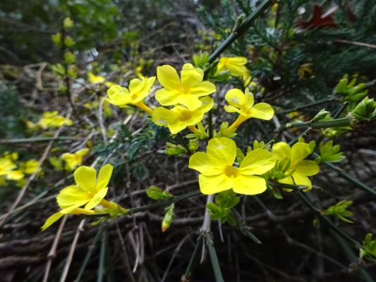 同じ磯の小路の石垣にオウバイ(黄梅)が咲いていました。毎年少しづつ