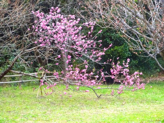 梅林にピンクの大きな花を咲かせている梅があります。この梅の木は剪定後
