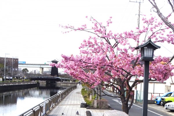 新川の櫓橋北側の河津桜です。左奥に櫓が見えています。