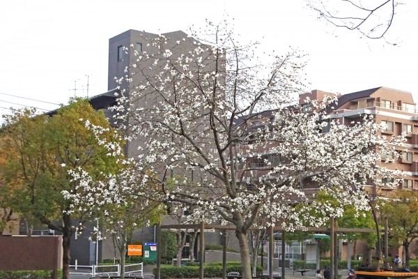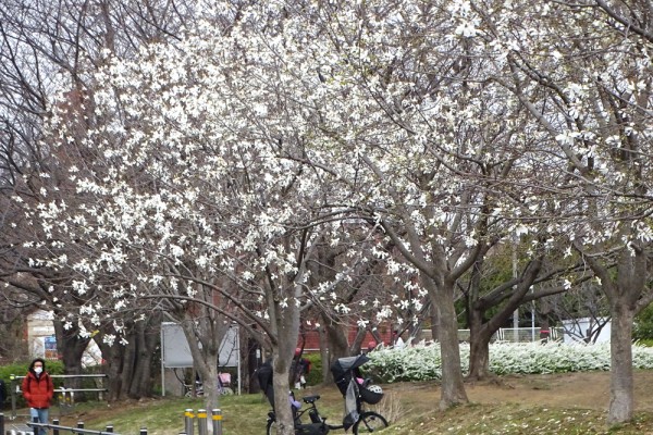 宇喜田公園には大きなコブシの樹が沢山あり、写真のように白い花が