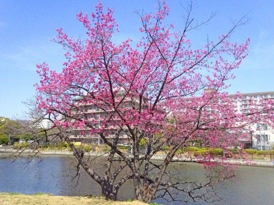 新左近川の新しく出来た売店近くに、赤い桜が咲いていました。