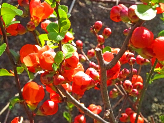 葛西臨海公園・鳥類園の磯の小路石垣にクサボケが咲き始めていました。