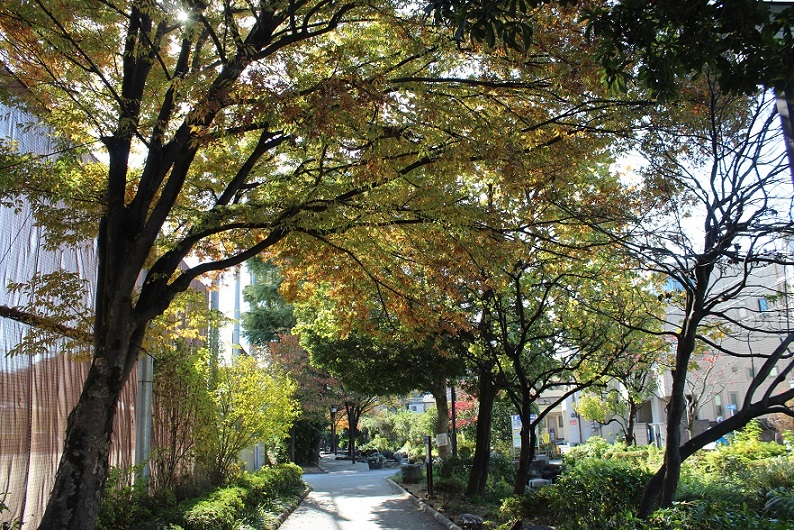 同潤橋からグリーンパレスへ向かう緑道でイチョウの紅葉グラデーション!