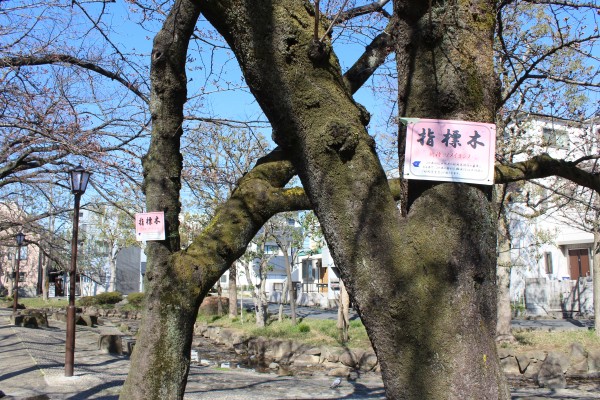 指標木1本に5輪の花が開花すると、江戸川区の「桜開花宣言」が出ます。