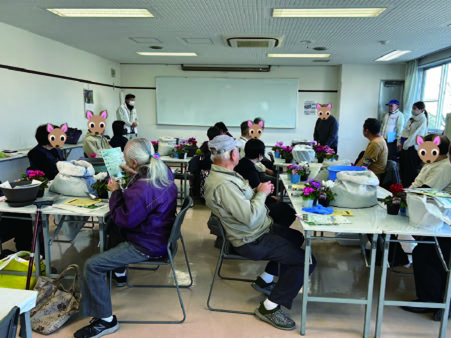 環境をよくする小松川平井地区協議会の緑育成部会の皆さんが「緑に関する講習会」で花とみどりの環境学習と花の寄せ植え体験をしました。
