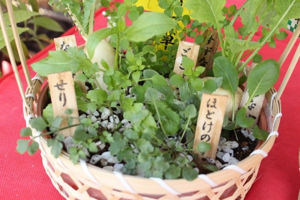 Nanakusa.... Seven harbs.... Japanese parseley, Shepherd's purs, Cudweed, Chickweed, Henbit, Turnip and Daikon radish. you can find them at the Ichinoe-Makkoutei.