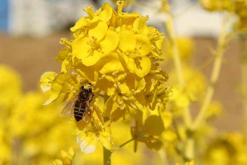 菜の花の蜜をミツバチが吸いに来ています。春の風景ですね!
