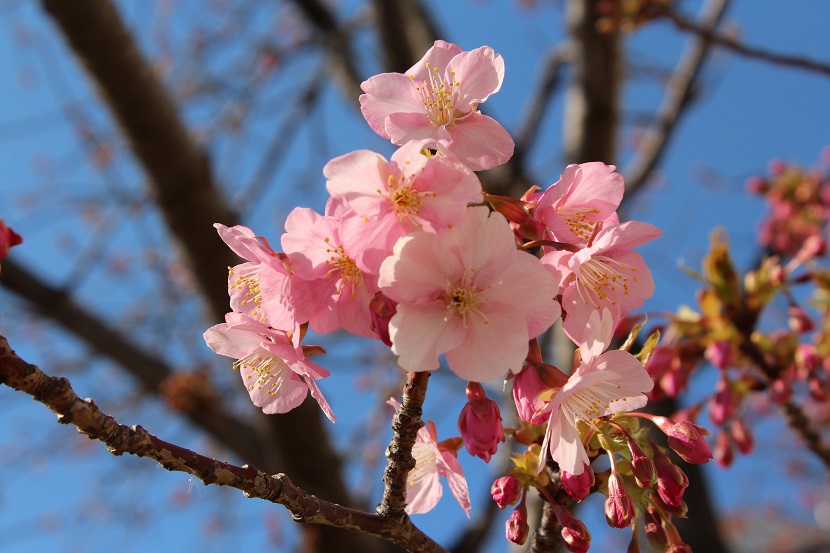 よく見るとふわっと咲いています。青空とピンク色の河津桜が映えます。