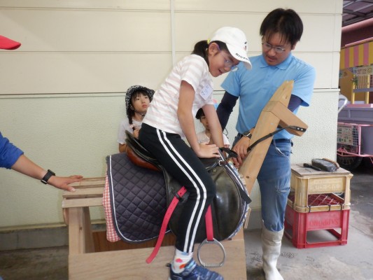 木馬を使用しての乗馬・下馬の練習や、馬装(ばそう:馬に鞍をつけること)等の体験をしました。