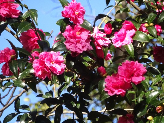 西側の水路の東屋の近くにサザンカがあり、赤い花が咲き誇っていました。