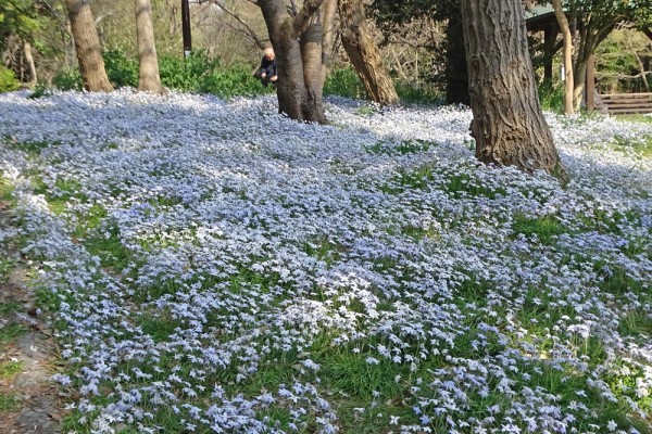公園の西側の水路の樹間が、ハナニラで覆われており、薄いブルーの絨毯を