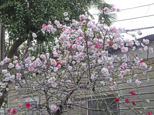 3月30日に西葛西の集合住宅の敷地のゲンペイモモ(源平桃)が咲き始めて