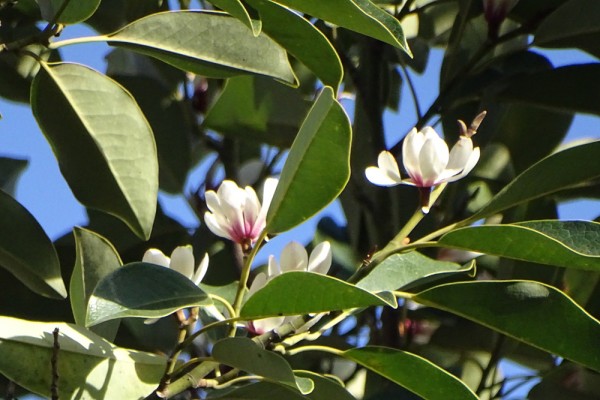 鳥類園には数本のオガタマノキ(招霊木)があり、鳥類園の入り口近くの木が咲いていました。この木は漢字が示しているように神聖な意味があり、神社やお寺に多くあります。