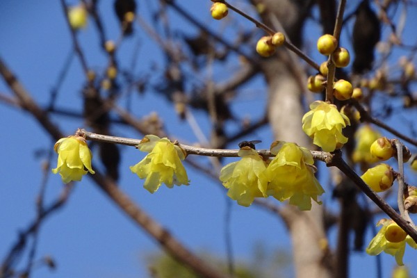 日本庭園の裏に黄色い蝋細工のようなロウバイが咲いており、メジロも密を