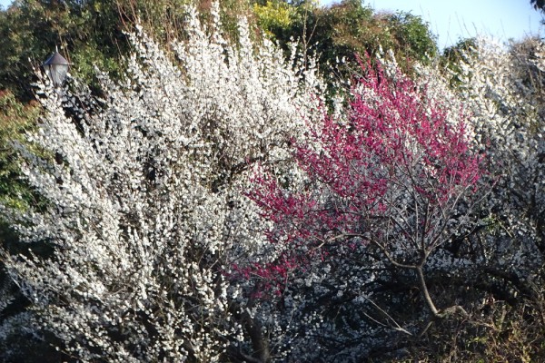同じ場所の梅ですが、右手前の紅梅と左後ろの白梅のコントラストがすごく