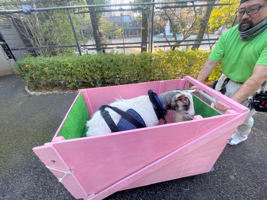 体調は日によって変化があり、歩けずに転んで座り込んでしまう日はお手製の台車でバックヤードまで帰ることもありました。